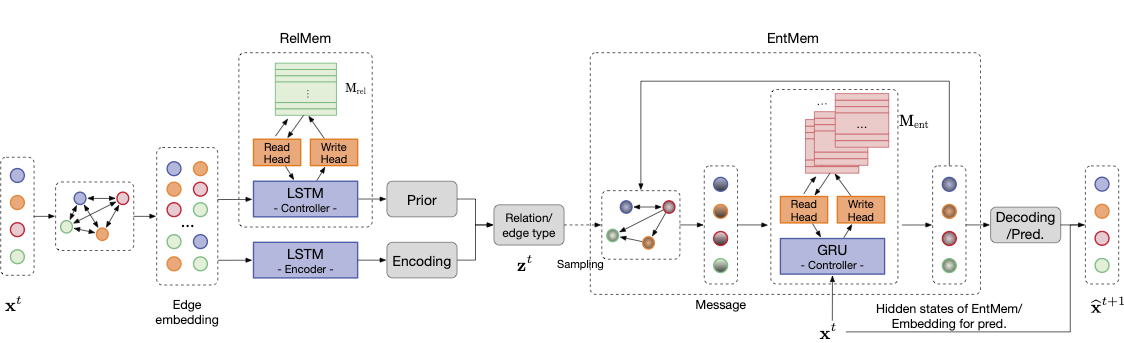 Dynamic interacting systems are prevalent in vision tasks. These interactions are usually difficult to observe and measure directly, and yet understanding latent interactions is essential for performing inference tasks on dynamic systems like forecasting. Neural relational inference (NRI) techniques are thus introduced to explicitly estimate interpretable relations between the entities in the system for trajectory prediction. However, NRI assumes static relations; thus, dynamic neural relational inference (DNRI) was proposed to handle dynamic relations using LSTM. Unfortunately, the older information will be washed away when the LSTM updates the latent variable as a whole, which is why DNRI struggles with modeling long-term dependences and forecasting long sequences. This motivates us to propose a memory-augmented dynamic neural relational inference method, which maintains two associative memory pools: one for the interactive relations and the other for the individual entities. The two memory pools help retain useful relation features and node features for the estimation in the future steps. Our model dynamically estimates the relations by learning better embeddings and utilizing the long-range information stored in the memory. With the novel memory modules and customized structures, our memory-augmented DNRI can update and access the memory adaptively as required. The memory pools also serve as global latent variables across time to maintain detailed long-term temporal relations readily available for other components to use. Experiments on synthetic and real-world datasets show the effectiveness of the proposed method on modeling dynamic relations and forecasting complex trajectories.