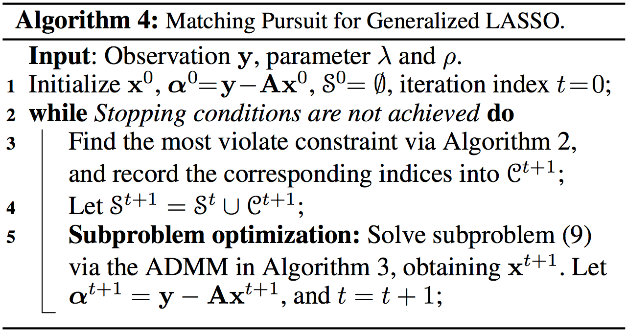 Unlike traditional LASSO enforcing sparsity on the variables, Generalized LASSO (GL) enforces sparsity on a linear transformation of the variables, gaining flexibility and success in many applications. However, many existing GL algorithms do not scale up to high-dimensional problems, and/or only work well for a specific choice of the transformation. We propose an efficient Matching Pursuit Generalized LASSO (MPGL) method, which overcomes these issues, and is guaranteed to converge to a global optimum. We formulate the GL problem as a convex quadratic constrained linear programming (QCLP) problem and tailor-make a cutting plane method. More specifically, our MPGL iteratively activates a subset of nonzero elements of the transformed variables, and solves a subproblem involving only the activated elements thus gaining significant speed-up. Moreover, MPGL is less sensitive to the choice of the trade-off hyper-parameter between data fitting and regularization, and mitigates the long-standing hyper-parameter tuning issue in many existing methods. Experiments demonstrate the superior efficiency and accuracy of the proposed method over the state-of-the-arts in both classification and image processing tasks.