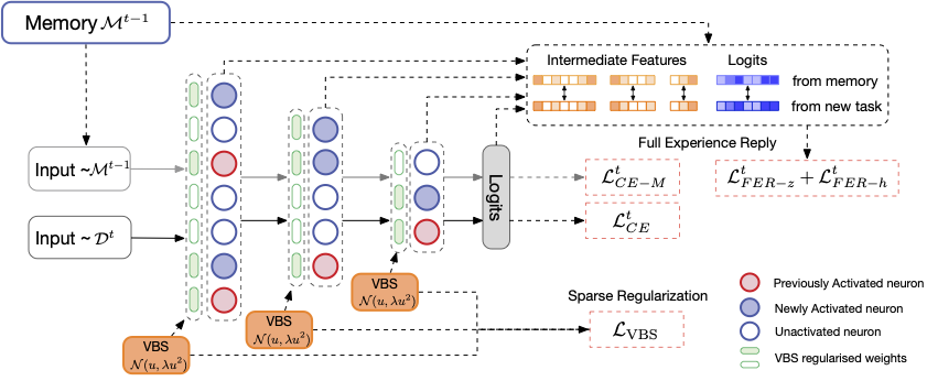 Continual Learning (CL) methods aim to enable machine learning models to learn new tasks without catastrophic forgetting of those that have been previously mastered. Existing CL approaches often keep a buffer of previously-seen samples, perform knowledge distillation, or use regularization techniques towards this goal. Despite their performance, they still suffer from interference across tasks which leads to catastrophic forgetting. To ameliorate this problem, we propose to only activate and select sparse neurons for learning current and past tasks at any stage. More parameters space and model capacity can thus be reserved for the future tasks. This minimizes the interference between parameters for different tasks. To do so, we propose a Sparse neural Network for Continual Learning (SNCL), which employs variational Bayesian sparsity priors on the activations of the neurons in all layers. Full Experience Replay (FER) provides effective supervision in learning the sparse activations of the neurons in different layers. A loss-aware reservoir-sampling strategy is developed to maintain the memory buffer. The proposed method is agnostic as to the network structures and the task boundaries. Experiments on different datasets show that SNCL achieves state-of-the-art result for mitigating forgetting.