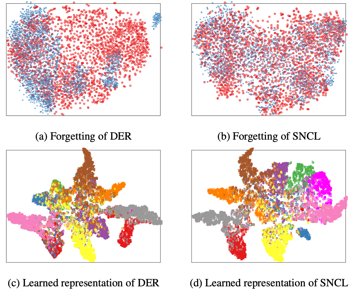 - (a) and (b) analyze the forgetting issue. Blue points are from a task after learning other tasks in CL; Red points are obtained from a single task no forgetting training as reference.